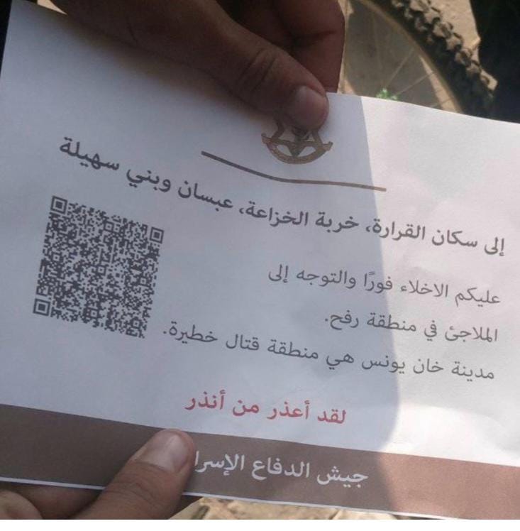 “To the inhabitants of al-Qarara, Khirbet al-Khuza’a, Absan and Bani Soheila,” the leaflets read. “You must evacuate immediately and go to shelters in the Rafah area. The city of Khan Yunis is a dangerous combat zone. You have been warned. Signed by the Israeli Defense Army.”